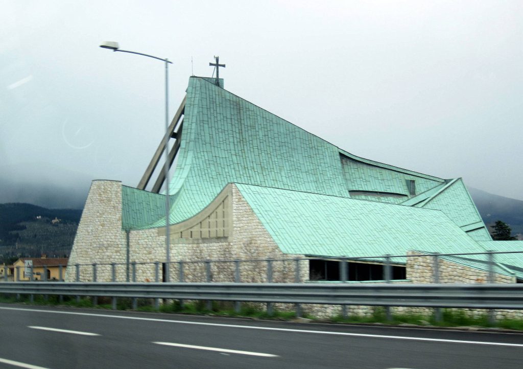 A Igreja Autostrada projetada por Giovanni Michelucci para celebrar a construção da Autostrada del Sole